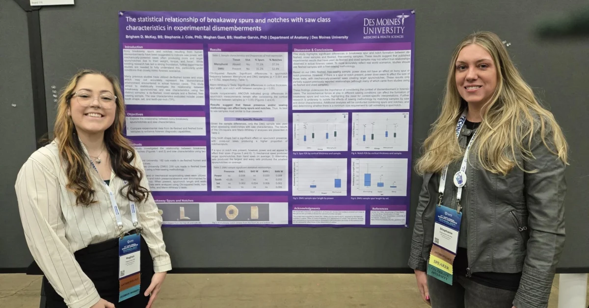Des Moines University Medicine and Health Sciences anatomy professor, Heather Garvin, Ph.D., along with postdoctoral researcher, Stephanie Cole, Ph.D., and DMU students Meghan Gast, M.S.A.’28 and Gloria Eddy, M.S.A.’29, attended the American Academy of Forensic Sciences conference in Baltimore in February 2025. The annual national conference unites leading forensic scientists from across the world to exchange knowledge, advance research and foster collaboration. Garvin, Gast and Eddy presented posters at the conference.