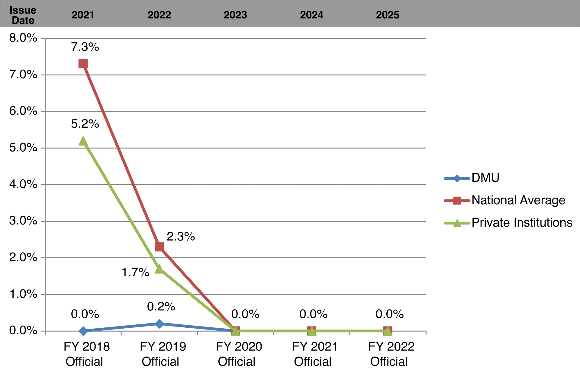 Chart showing 3-year cohort default rate of Des Moines University, compared to the national average and private institution average.